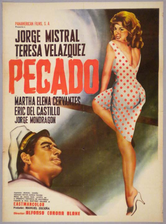Beautiful crime film poster presents a very sexy main image -- featuring the ultimate femme fatale! The art work shows off some of the best attributes of the shapely Ms. Velazquez. WOW!!! This is a used poster with some wear and separation along the fold lines and a small repaired hole in the dark green background area, but these flaws are not very distracting. The onesheet will still display very well... The film starred Jorge Mistral, Teresa Velazquez, Marta Elena Cervantes, Eric del Castillo and Jorge Mondragon. (This poster has only limited, very mild fold lines -- so it will be sent rolled.) $40