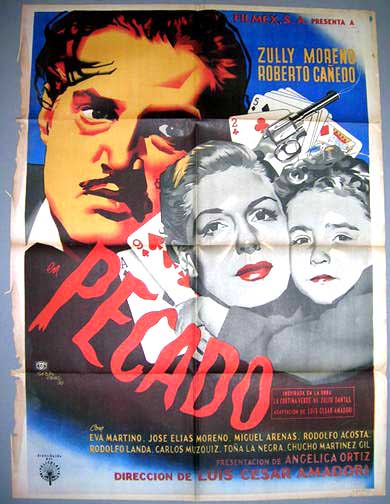 Striking noir / crime / gambling film poster features several icons of the genre -- a doomed and haunted protagonist, a deck of gambling cards, and a gun. Great style! There is some heavy wear and water damage along the left side border. However, this flaw does not greatly affect the main image area, which is clean and bright. The border could be restored fairly easily, and the poster would look excellent... This movie starred Zully Moreno, Roberto Canedo, Eva Martino, Jose Elias Moreno and Miguel Arenas. $30