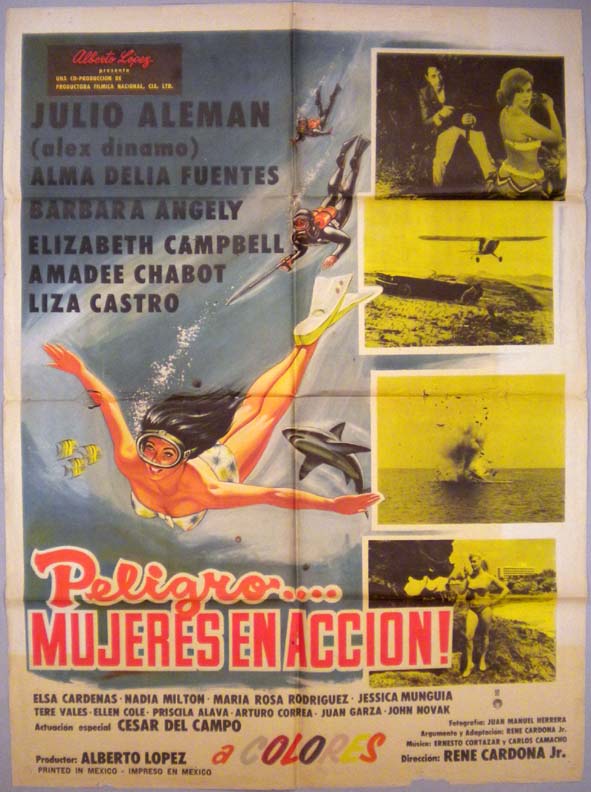 Colorful artwork highlights the poster from this 1967 Mexican comedy / spy film -- with a great image of a sexy woman scube diving. There are also several inset scenes from the film pictured. The poster has general signs of wear and usage, including: separation along the fold lines, edge wear, tears, border chips, holes and surface marks/dings. The flaws are not too distracting, and otherwise, the poster will display well... This movie starred Julio Aleman, Alma Delia Fuentes, Elizabeth Campbell, Barbara Angely and Amadee Chabot. $40