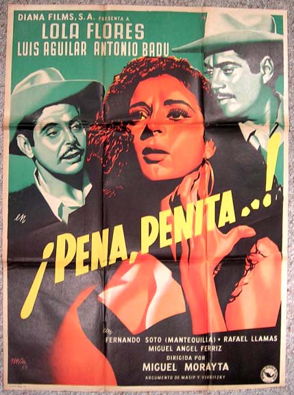 Gorgeous comedy film poster features lurid, melodramatic graphics that make it look more like a film noir / crime movie. The onesheet features great images of the three main stars -- especially the very sexy Ms. Flores. The poster has average signs of use -- including some wear/separation along the fold lines. However, none of these flaws are too distracting, and the onesheet will still display very well... This movie starred Lola Flores, Luis Aguilar, Antonio Badu and Fernando 'Mantequilla' Soto. $60