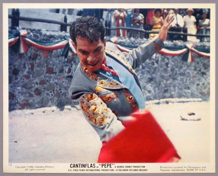 Beautiful original color still from the 1960 Columbia comedy film, Pepe -- which starred beloved Mexican comedian, Mario 'Cantinflas' Moreno. The mini lobby card measure 8x10 inches. The photo pictures Cantinflas as a bullfighter. $10