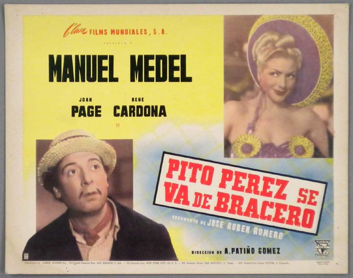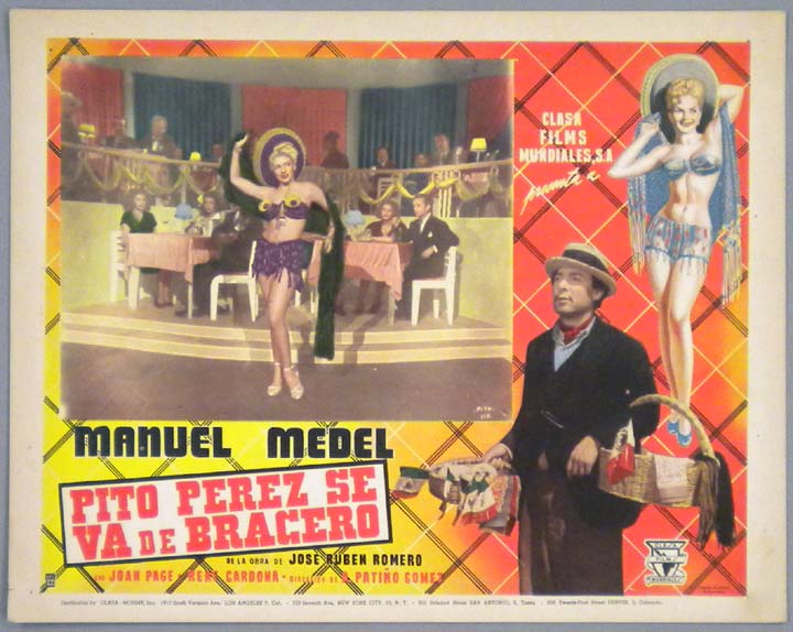 Rare Mexican movie title lobby card for an early comedy film. Mexican title cards are quite rare, as few were ever produced and most lobby card sets do not include one. This one pictures comedian Medel, plus the lovely Ms. Page -- who is dressed in a sexy showgirl outfit... The film starred Manuel Medel, Joan Page, Rene Cardona and Arturo Castro 'Bigoton.' $20
