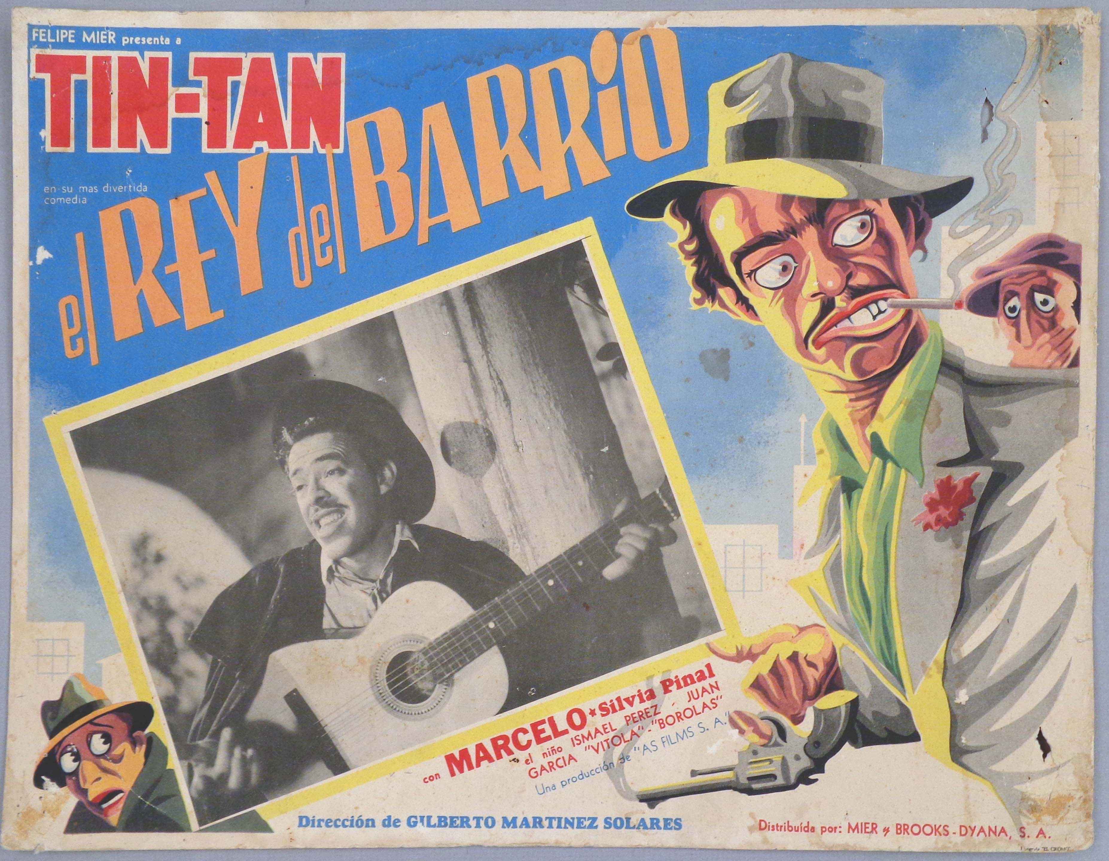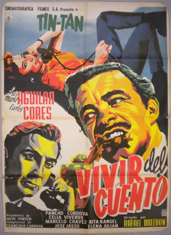Great comedy film poster presents a colorful close-up portrait of comedian 'Tin Tan,' plus features an image of the two romantic leads talking on the telephone. This is a used poster that has some signs of handling-- separations at the fold lines, edge wear, small tears, and surface dings -- but the flaws are not very distracting and it will display quite well... This movie starred German 'Tin Tan' Valdes, Luz Maria Aguilar, Carlos Cores and Pancho Cordova. $30