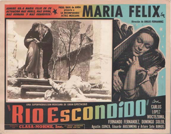 Classy Mexican award-winning film lobby card with a nice image of Ms. Felix in both the border art and in the B&W photo-scene. The card has signs of handling -- pinholes, corner bends, a repaired tear/crease above the lower right corner -- but these flaws are not very distracting... This movie starred Maria Felix, Carlos Lopez Moctezuma, Fernando Fernandez, Agustin Isunza and Domingo Soler. $20