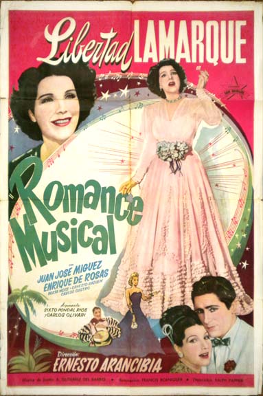 Colorful Argentine onesheet poster (29x43") from a Spanish-language musical film. The onesheet pictures a great image of Ms. Lamarque, plus an attractive montage of other scenes of the movie. There is wear and tears along the folds and edges, plus a hole at the center of the upper fold. However, the colors are bright and the poster would not be difficult to repair... The film starred Libertad Lamarque, Juan Jose Miguez, Carlos Castro and Bertha Moss. $30