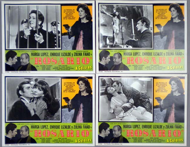 Colorful set of 4 Mexican film lobby cards which feature colorful artwork of popular star, Marga Lopez in the color art. The B&W photo-scenes feature great shots of sexy Zulma Faiad. You get all 4 cards for one low price! (Any glare visible in the photo was caused by a problem with our camera -- it is not a flaw on the cards themselves)... This movie also starred Enrique Lizalde, Aldo Monti, Zulma Faiad and Jose Galvez. $20 (for 4 cards)