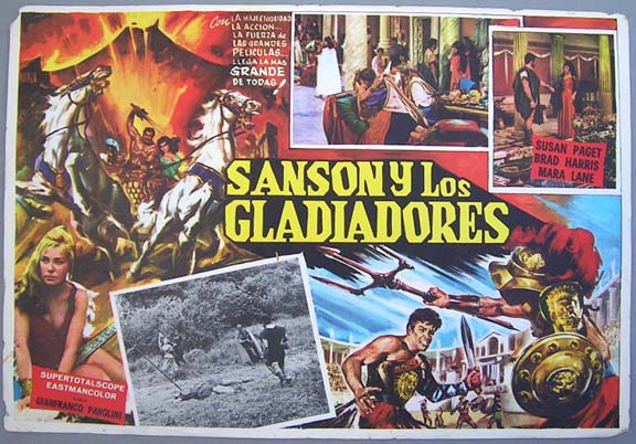 Colorful Mexican half-sheet (or Giant lobby cards) poster for an Italian sword and sandal film. The graphics feature a montage of scenes from the film, including beefcake hero Brad Harris. This is a horizontal format poster that measures approximately 16.5"x 24." These half-sheet posters (printed on heavy stock paper) were produced in place of standard Mexican lobby cards for some films. Giant lobby cards feature full-color artwork covering most of the poster, with a small B&W inset image picturing a scene from the film. This poster has some light wear on the borders, but the image area is clean and bright. The last card we have left has a different B&W scene than pictured, but the color at work is identical... This movie starred Brad Harris, Mara Lane, Susan Paget and Jany Clair. (Rolled) $20