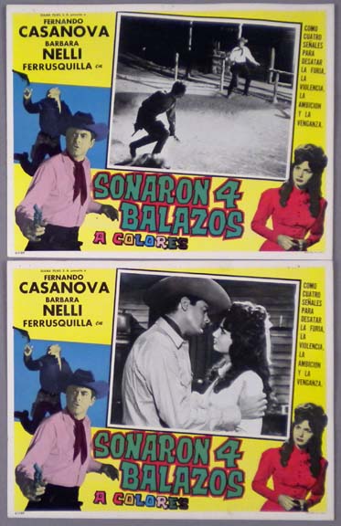 Nice group of 2 Azteca lobby cards for a Spanish western film. The cards feature colorful artwork and great glossy inset scenes picturing the main stars. You get both cards for one low price!... This film starred Fernando Casanova, Liz Poitel, Barbara Nelli and Paul Piaget. $10 (for 2 cards)