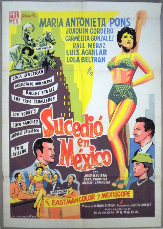 Vibrant Mexican screen style film poster with artwork that was quite unusual for it's time. The onesheet features colorful image of Pons in a bikini, plus pictures other cast members... This movie starred Maria Antonieta Pons, Joaquin Cordero, Domingo Soler, Lola Beltran and Raul Meraz. $40