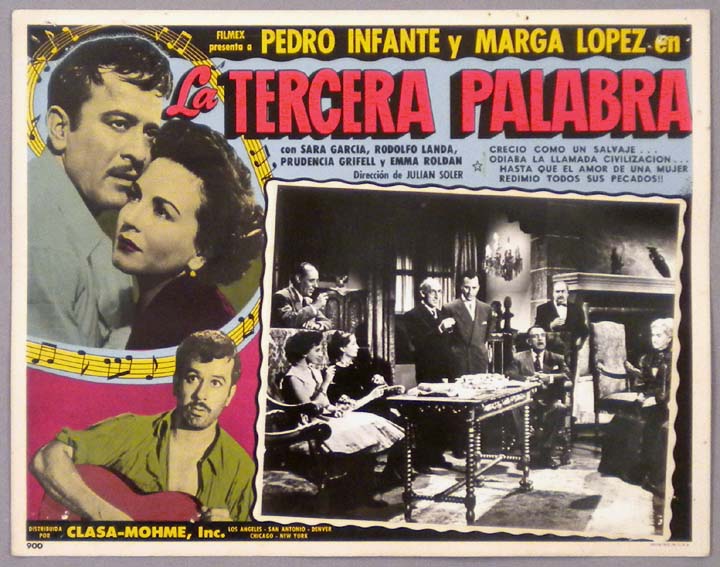 Eye-catching lobby card from an award-winning, Mexican film. The card film lobby card features great images of popular actor Infante on the border art. The card has average signs of handling -- a number of pinholes and a few light bends -- but the colors are bright and there are no major flaws... The film starred Pedro Infante, Marga Lopez, Sara Garcia, Prudencia Grifell and Rodolfo Landa. $10