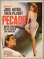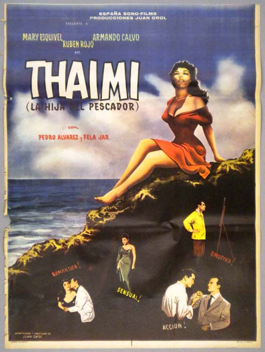 Beautiful Mexican movie poster pictures the sexy Ms. Esquivel sitting on a rocky cliff, above the sea. There are also smaller images of other characters from the film. Vivid coloring and lovely design! The poster has wear and tears along the edges/borders, plus a long repaired tear along the dark brown portion at the bottom. However, the tear is not very noticeable, and if matted and framed, the poster will actually display quite well... The film starred Mary Esquivel, Armando Calvo, Ruben Rojo, Fela Jar, Pedro Alvarez and Rosendo Rosell. (This poster has only limited, very mild fold lines -- so it will be sent rolled.) $30