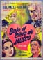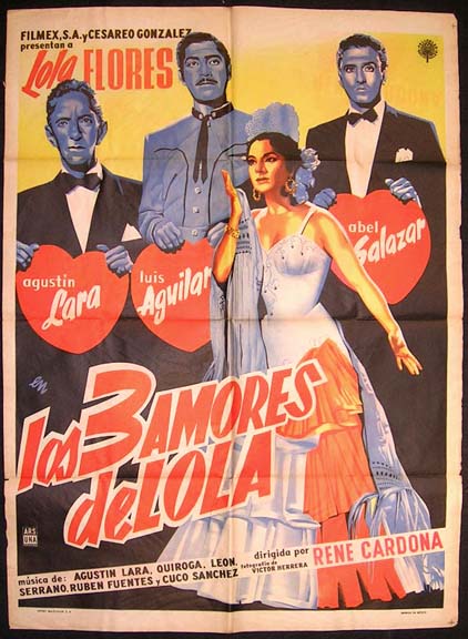 Wonderful comedy film poster has great images of the four main stars. Beautiful Lola Flores tries to choose between her three suitors -- each of whom is holding a heart. This onesheet appears to have gotten damp at some point, leaving some mild waviness and light water marks on the yellow background area near the top. However, these flaws are not very distracting, and otherwise, the poster looks great... This movie starred Lola Flores, Agustin Lara, Luis Aguilar, Abel Salazar, Nono Arsu and Luis Musset. $30