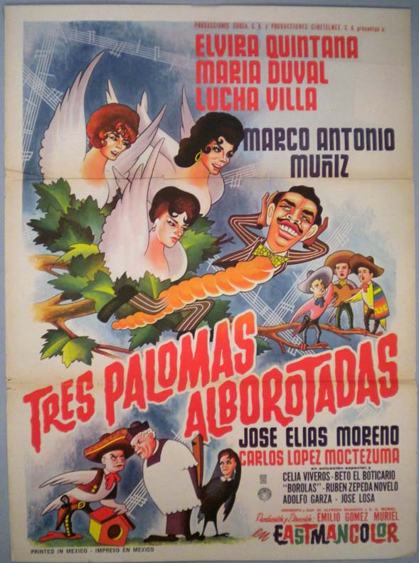 Colorful Mexican musical comedy film poster features wonderful caricatures of the four main stars -- with the three woman portrayed as hungry birds, and Muniz appearing as the worm they are chasing. The poster has some wear and repairs along the bottom fold, but this flaw is not very distracting. Otheriwse, the colors are bright and it will display well!... This movie starred Elvira Quintana, Maria Duval, Lucha Villa, Marco Antonio Muniz, Carlos Lopez Moctezuma and Jose Elias Moreno. (This poster has only limited, very mild fold lines -- so it will be sent rolled.) $30