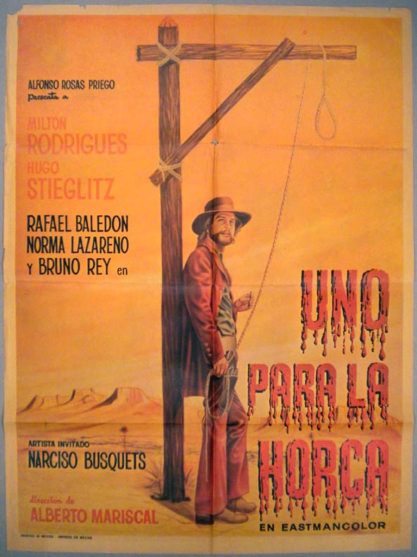 Striking western film poster pictures a gunman figure standing beneath a hangman's noose. It features a spaghetti Western style! This is a used poster that has some signs of handling-- separations at the fold lines, edge wear/tears, small holes, and surface dings. However, the flaws are not very distracting and it will display quite well... This movie starred Milton Rodriguez, Hugo Stiglitz, Rafael Baledon and Norma Lazareno. $30