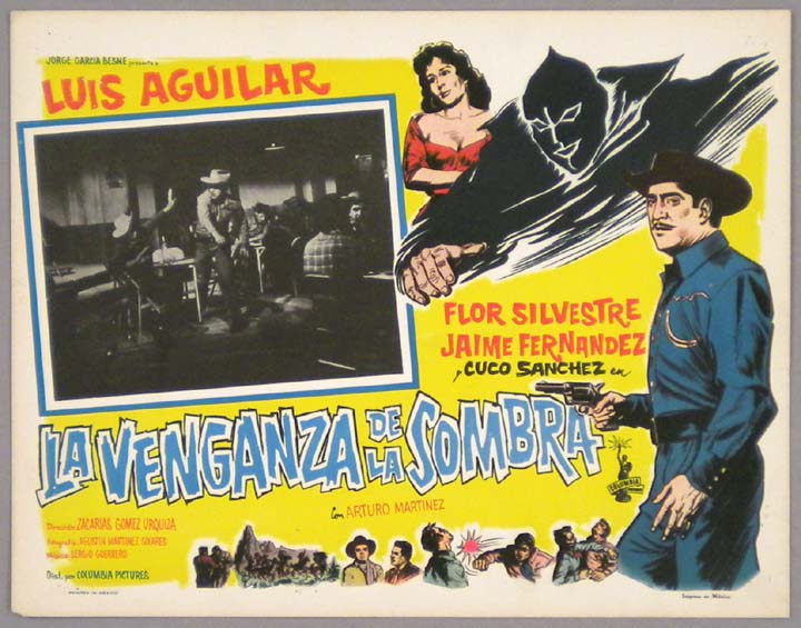 Attractive masked hero / western film lobby card (11x14") features a nice image of the star, Luis Aguilar, plus a great portrait of the hero he portrays -- La Sombra Vengadora. Average signs of use -- pinholes and mild soiling -- but no major flaws... The film starred Flor Silvestre, Jaime Fernandez, Cuco Sanchez, Arturo Martinez and Fernando Oses. $10 each