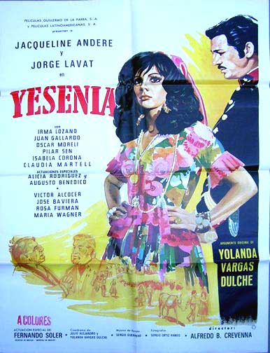 Colorful romance film poster features a great image of the sexy Ms. Andere wearing an outfit from the period... This movie starred Jacqueline Andere, Jorge Lavat, Irma Lozano and Juan Gallardo. $10