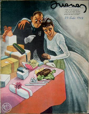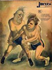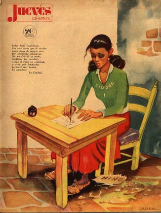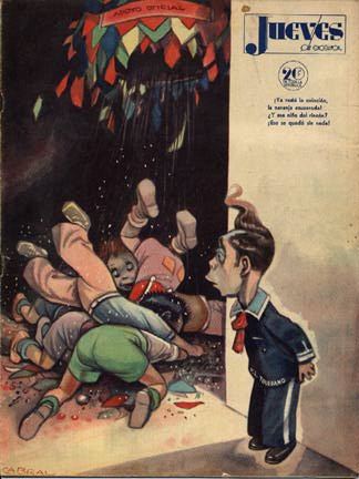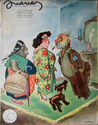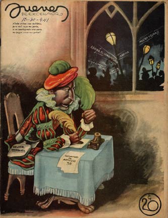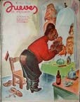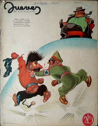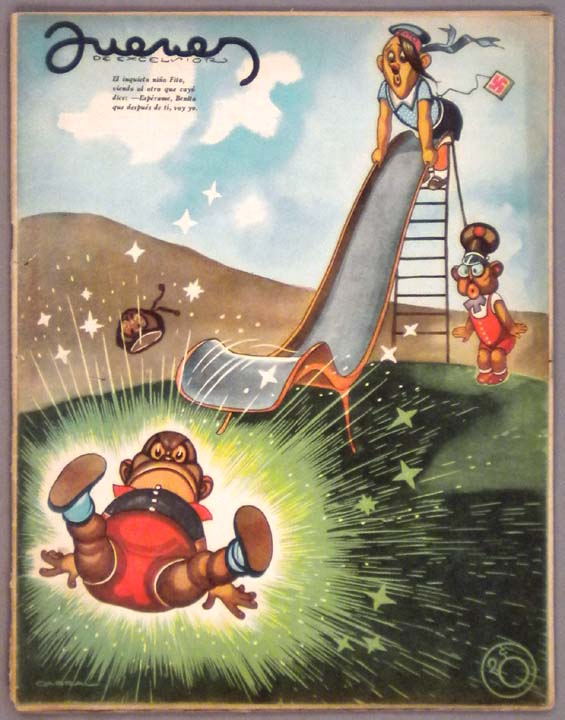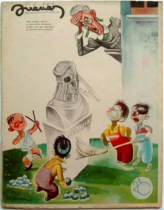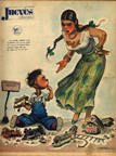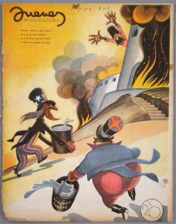 Jueves de Excelsior Magazine was a newsprint style weekly publication printed every Thursday in Mexico. Most covers of the magazine were produced by two artists: Ernesto Garcia Cabral and Freyre. This page features a selection of Cabral covers from the 1930s and 1940s. Each issue combines stories on politics and current news events, with wide coverage of the arts, fashion, medicine, sports and cinema -- both U.S. and Mexican films. (There is especially heavy coverage of bullfighting, and of Hollywood movie stars -- including numerous wonderful photos). The magazine features full-color covers, with sepiatone (or black and white) inside pages. The issues published before June, 1941 usually measured approximately 8.75x11.25 inches. The issues published after June, 1941 usually measured approximately 10x12.5 inches. ............. We believe that most people will buy these magazines for the cover art, so the condition rating mainly describes the front cover. If we have noticed damage to the back cover, or to the inside pages, we will note it in the description. ............ Jueves de Excelsior was printed on cheap newsprint paper, so they were really not designed to last for the ages. Most issues we've seen in the past were in very poor condition (so poor in fact, that we did not feel they were good enough to offer to our customers). Recently we were quite lucky to have had the opportunity to purchase this collection, which is in far better than average condition. But, although we are proud to now offer these rare magazines, many of the covers do have some wear along the edges and some have the date/number written on the cover. However, if matter and framed, many (or most) of these flaws would not be visible. Please contact us with any questions regarding condition, or content, of any specific issues.