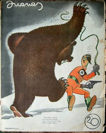 Stories on WW2, Charles Chaplin and other Hollywood stars. There is also a full-page Cantinflas comic strip. Measures approximately 10x12.75 inches. Heavy spine wear, edge wear, a few small stains, a pen-written date near top edge. Main artwork not greatly affected.