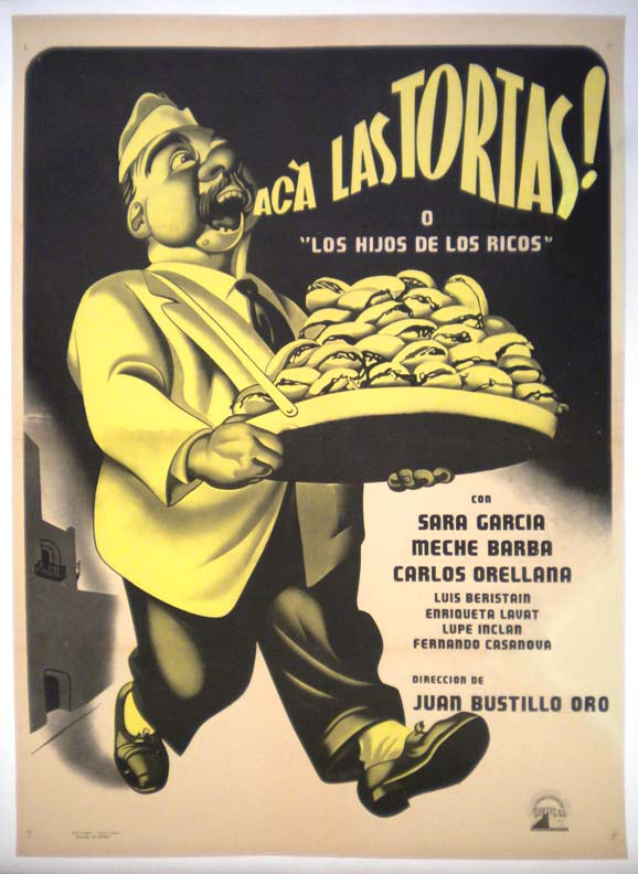 Attractive and stylish Mexican comedy movie poster pictures a vender carrying a plate of sandwiches. Early art work by Ernesto Garcia Cabral! This poster has been professionally mounted on linen, with some restoration along some of the fold lines and on the ! after the word Tortas in the title. However, the poster looks great and is ready to display!... The film starred Sara Garcia, Meche Barba, Carlos Orellana, Luis Beristain and Lupe Inclan. (This poster is mounted on linen, so it must be sent rolled.) $350 |