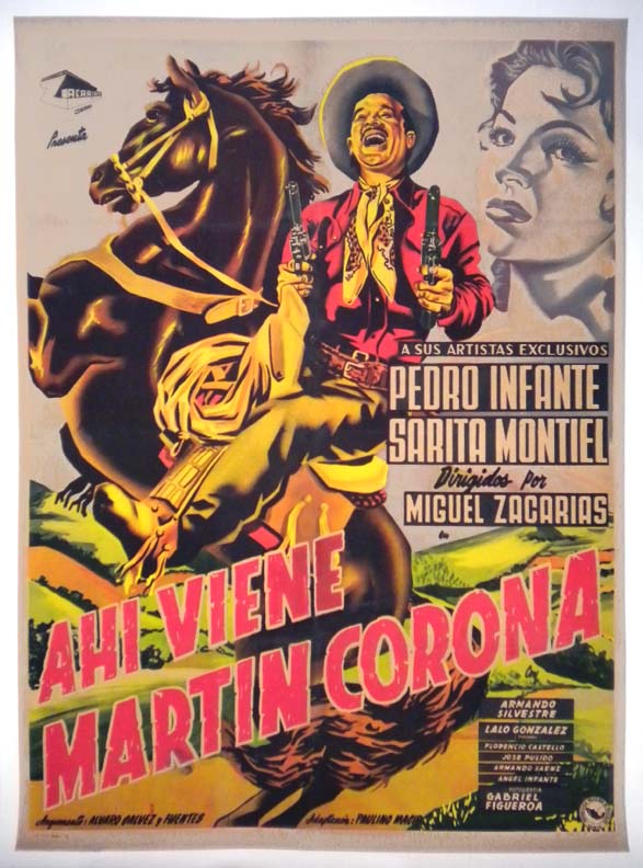 Classic Mexican western / ranchera film poster has a fantastic image of Pedro Infante on horseback, belting out a song while gripping 6-guns in both hands. This poster was produced using the intricate silkscreen process. There is some touch-up around the E in VIENE, but this does not detract from the main image. Otherwise, the poster will display very well... This movie starred Pedro Infante, Sara Montiel, Eulalio 'Piporro' Gonzalez and Armando Silvestre. (This poster is mounted on linen, so it must be sent rolled.) $395 |