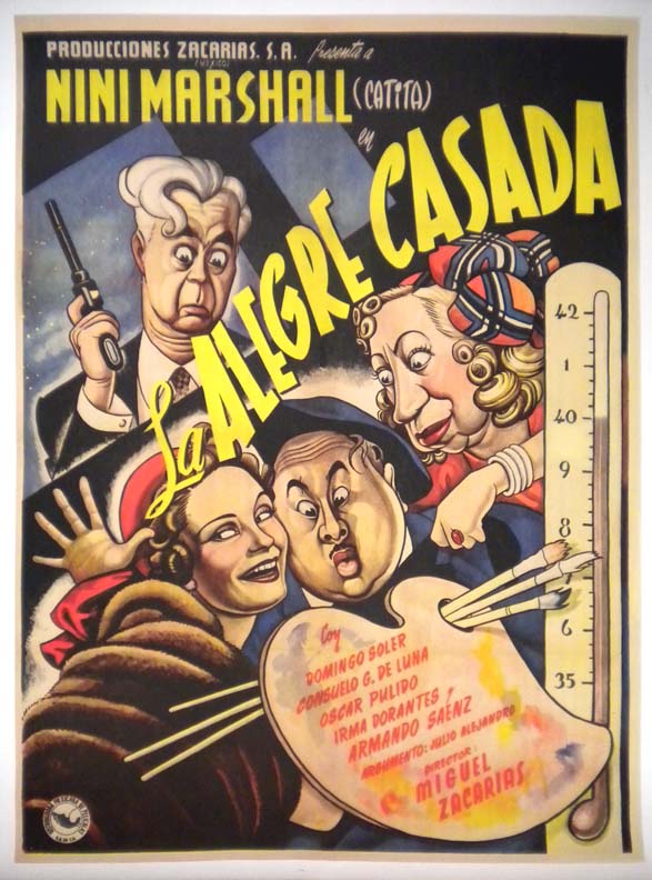 Superb comic artwork featuring wonderful caricatures of two men and two women -- in the classic Ernesto Garcia Cabral style. This Mexican poster has been professionally mounted on linen, with some restoration along the left edge/border. It looks great and is ready to display!... This movie starred Nini Marshall Catita, Domingo Soler, Oscar Pulido, Armando Saenz and Irma Dorantes. (This poster is mounted on linen, so it must be sent rolled.) $395 |