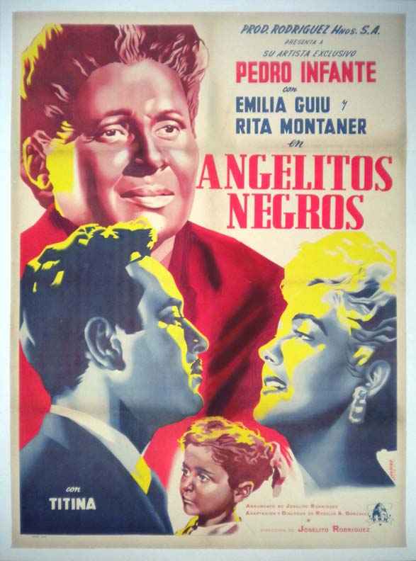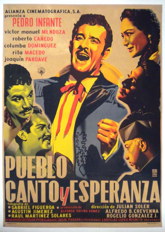 Charming Mexican drama / family movie poster features great close-up images of several of the main cast, including a wonderful portrait of beloved film icon, Pedro Infante. This poster has been professionally mounted on linen, with some light touch-up along some of the fold lines. However, the poster will display very well!.. The film starred Pedro Infante, Emilia Guiu, Rita Montaner and Chela Castro. (This poster is mounted on linen, so it must be sent rolled.) $325 |