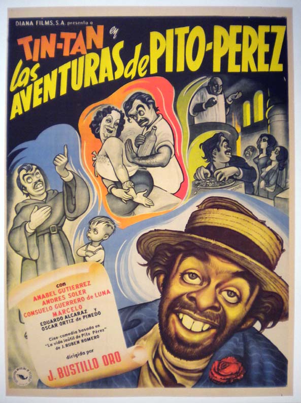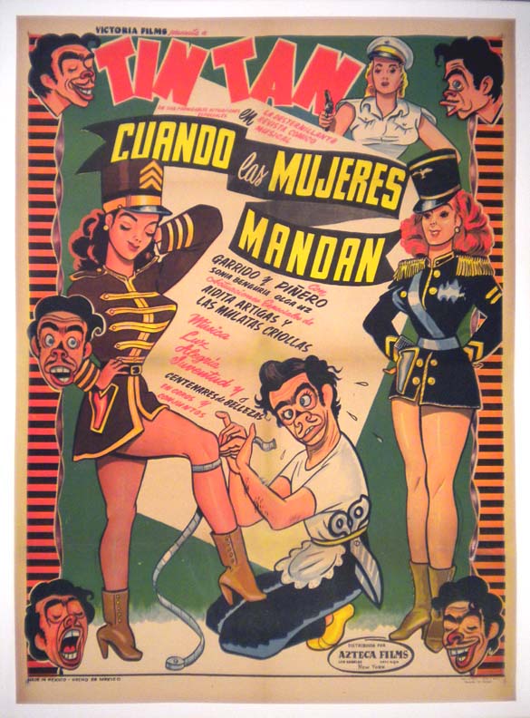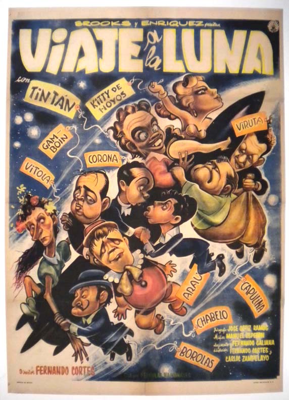 Colorful Mexican movie poster from a Cuban-produced Tin Tan comedy film. The onesheet features vibrant colors and wonderful, Cabral-like graphics. Many collectors attribute the poster to Cabral, and the graphics certainly have the right style -- right down to Tin Tan's extended pinkiesThere is some toning along the vertical fold, but otherwise, the poster looks great... The film starred German 'Tin Tan' Valdes, Garrido y Pinero, Sonia Benguria, Olga Uz, Aidita Artigas and Las Mulatas Criollas. (This poster is mounted on linen, so it must be sent rolled.) $495 |