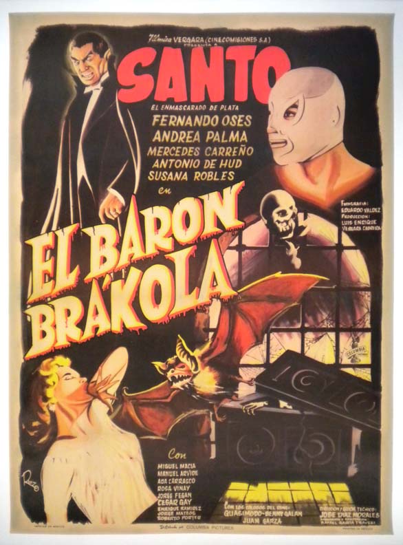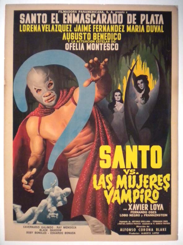 Attractive Mexican lucha libre / horror film poster pictures masked wrestling icon, El Santo, who must deal with a wrestling vampire, a large drooling bat, plus a sexy woman in distress. This is one is hardest to find of all Santo posters... The film starred El Santo, Fernando Oses, Gina Romand, Jessica Munguia and Jorge Peral. (This poster is mounted on linen, so it must be sent rolled.) $395 |