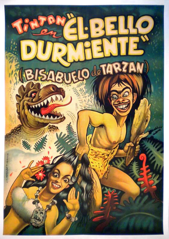 Spectacular Mexican comedy movie poster pictures Tin Tan as a caveman, who has his attention divided by sexy cavegirl .del Valle and a hungry dinosaur. Among the best and most desirable posters produced by Ernesto Garcia Cabral! This borderless poster has been professionally mounted on linen and it is ready to display!... The film starred German 'Tin Tan' Valdes, Lilia del Valle, Wolf Ruvinskis and Marcelo Chavez. (This poster is mounted on linen, so it must be sent rolled.) $1995 |