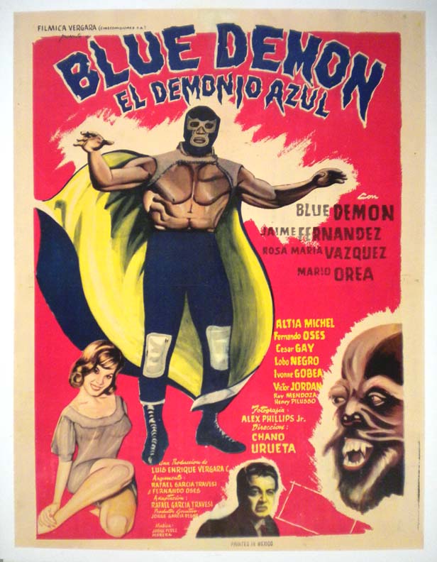 Memorable Mexican horror movie poster features an incredible montage of surreal images, including: Blue Demon, a bat, and a monster attacking a buxom woman. Rare onesheet from the Vergara lucha libre series... The film starred Blue Demon, Jaime Fernandez, Fernando Oses, Murcielago Velazquez and Marta Romero. (This poster is mounted on linen, so it must be sent rolled.) $450 |
