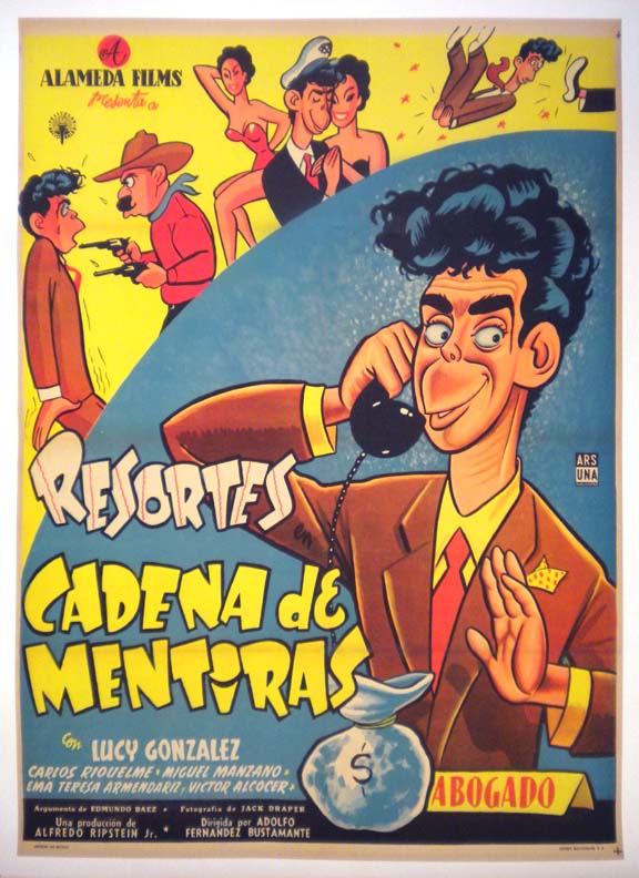 Very colorful Mexican comedy movie poster features a large caricature of popular comedian Resortes talking on a telephone. Beautiful... The film starred Adalberto 'Resortes' Martinez, Lucy Gonzalez, Carlos Riquelme, Miguel Manzano and Emma Teresa Armendariz. (This poster is mounted on linen, so it must be sent rolled.) $395 |