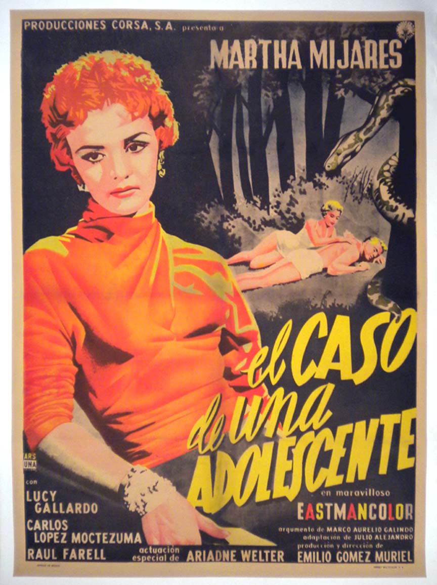 Wonderful Mexican melodrama movie poster features a great central image of the lovely Ms. Mijares, who plays one of the girls in trouble... The film starred Martha Mijares, Lucy Gallardo, Ariadna Welter, Carlos Lopez Moctezuma and Raul Farell. (This poster has only limited, very mild fold lines -- so it will be sent rolled.) $365 |