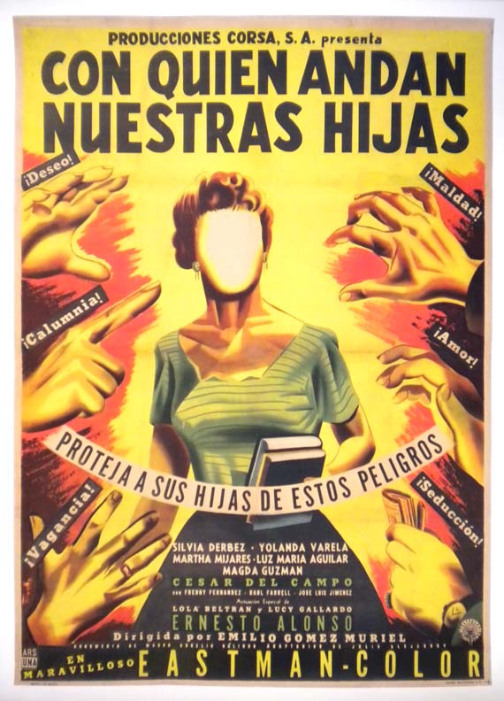 Unusual and highly surreal Mexican movie poster shows a number of hands, all pointing at or reaching for a faceless woman. Lush colors highlight this striking image!... The film starred Silvia Derbez, Martha Mijares, Luz Maria Aguilar, Yolanda Varela and Raul Farell. (This poster is mounted on linen, so it must be sent rolled.) $395 |