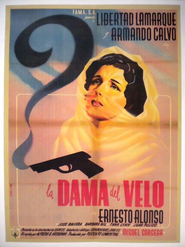 Unusual Mexican melodrama / crime film poster features a nice portrait of Ms. Lamarque ...with a question mark and a smoking gun hovering nearby. Effective early art work by Espert!... The film starred Libertad Lamarque, Armando Calvo, Ernesto Alonso, Jose Baviera and Barbara Gil. (This poster is mounted on linen, so it must be sent rolled.) $275 |