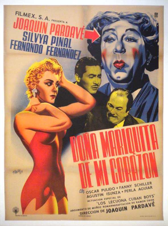 Beautiful Mexican comedy movie poster features a very sexy image of Ms. Pinal in a swimsuit, with nice portraits of Pardave (in drag) plus several of the other stars. This is not your typical Renau poster -- he seldom designed art work for comedies. There is some toning along the lower fold and some general touch-up, but these do not greatly detract from the beautiful main image... The film starred Joaquin Pardave, Silvia Pinal, Fernando Fernandez, Perla Aguiar and Agustin Isunza. (This poster is mounted on linen, so it must be sent rolled.) $395 |