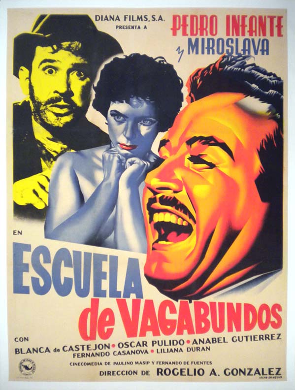 Attractive Mexican comedy / musical movie poster features wonderful Renau like graphics featuring two nice images of Mexican screen icon Infante, with lovely Miroslava in between!... The film starred Miroslava Stern, Blanca de Castejon, Anabelle Gutierrez and Oscar Pulido. (This poster is mounted on linen, so it must be sent rolled.) $495 |