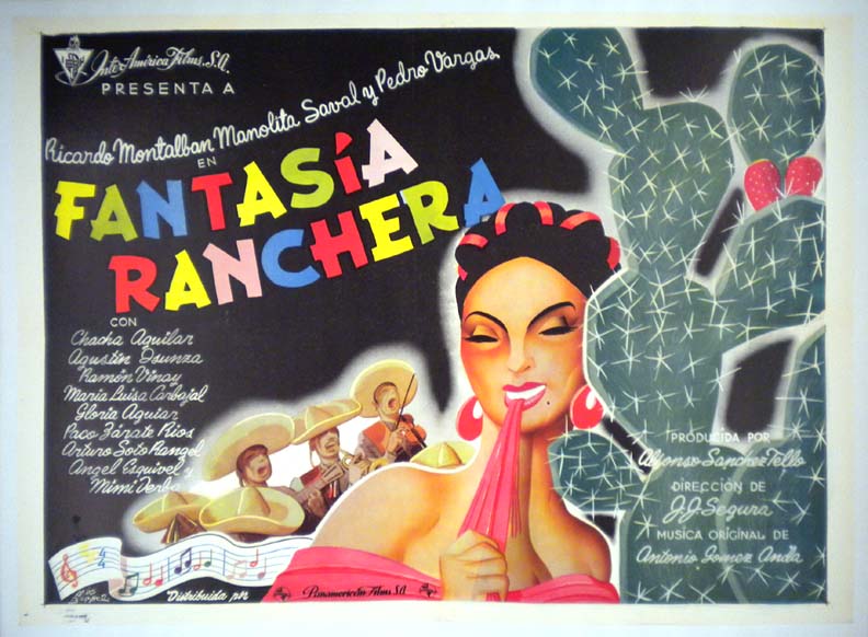 Gorgeous Mexican musical / ranchera movie poster laid out in a rare horizontal format. The artwork pictures a lovely senorita being serenaded by three cabelleros as she stands beside a cactus... The film starred Ricardo Montalban, Manolita Saval, Pedro Vargas, Josefina Aguilar, Ramon Vinay and Gloria Aguiar. (This poster is mounted on linen, so it must be sent rolled.) $1295 |