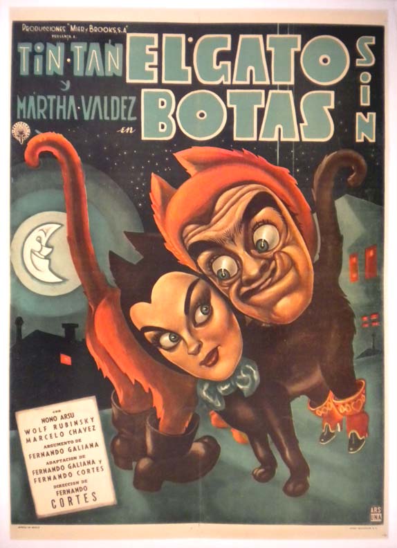 Magnificent Mexican comedy film poster by Ernesto Garcia Cabral -- unique even by the artist's standards. Tin Tan and the lovely Ms. Valdes are presented as alley cat's, who are prowling the city streets at night. This poster is one of my personal favorites... The film starred German 'Tin Tan' Valdes, Martha Valdes, Nono Arsu, Wolf Ruvinskis and Marcelo Chavez. (This poster is mounted on linen, so it must be sent rolled.) SOLD |
