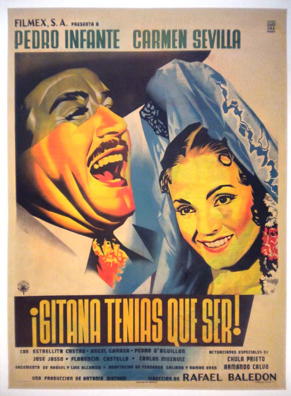 Attractive Mexican musical / comedy / romance film poster with good color and great close-up images of Infante and Sevilla. The poster may have some mild discoloration throughout the surface -- likely a slight printing flaw. However, this flaw is not very distracting and this classic onesheet will display quite well... The film starred Pedro Infante, Carmen Sevilla, Estrellita Castro and Chula Prieto. (This poster is mounted on linen, so it must be sent rolled.) $295 |