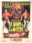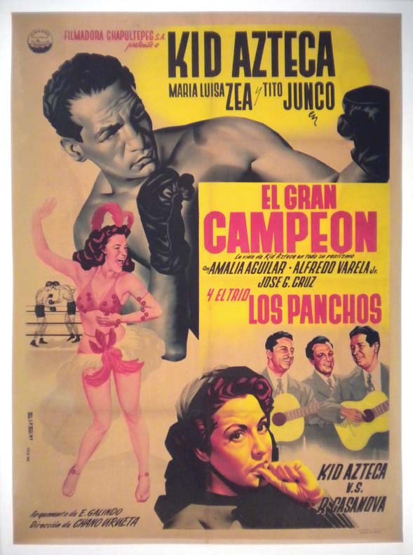 Compelling Mexican boxing movie poster pictures a vender carrying a plate of sandwiches. Early art work by Ernesto Garcia Cabral!... The film starred Luis 'Kid Azteca' Villanueva, Maria Luisa Zea, Tito Junco, Amalia Aguilar, Alfredo Varela and Jose G. Cruz. Mr. Cruz went on to be the highly successful publisher of comics -- including the long running El Santo series! There is some general toning, but the poster displays beautiully! The film starred Luis Villanueva "Kid Azteca," Maria Luisa Zea, Tito Junco and Amalia Aguilar. (This poster is mounted on linen, so it must be sent rolled.) $475 |