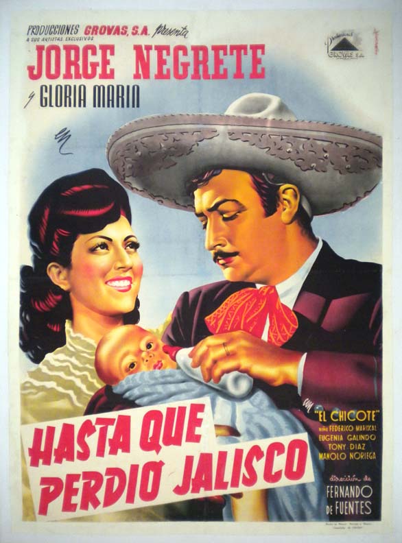 Beautiful early Mexican western / ranchera movie poster pictures a wonderful image of Negrete romancing the lovely Ms. Marin. It is very difficult to find posters from this era -- and this one is a beaut!... The film starred Jorge Negrete, Gloria Marin, Armando Soto La Marina and Federico Mariscal. (This poster is mounted on linen, so it must be sent rolled.) $450 |