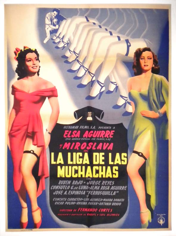 Stylish Mexican musical / comedy film poster -- with a dancing-motif -- has great color and striking graphics. It pictures two scantily-clad women and lots of lovely dancing legs. Beautiful poster with great style! There is a bit of rtoning/estoration along the top fold line, but this is not very distracting and the poster will display quite well... The film starred Elsa Aguirre, Miroslava Stern, Ruben Rojo, Consuelo Guerrero de Luna and Jorge Reyes. (This poster is mounted on linen, so it must be sent rolled.) $375 |