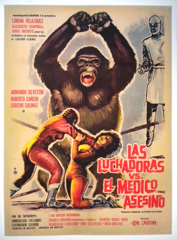 Fantastic Mexican horror / sci-fi / lucha libre film poster features a great illustration of a monstrous ape, plus images of the two battling female luchadoras. First film of the classic Wrestling Women series ... it was released in the USA as, Doctor of Doom... The film starred Lorena Velazquez, Elizabeth Campbell, Armando Silvestre and Roberto Canedo. (This poster is mounted on linen, so it must be sent rolled.) SOLD |