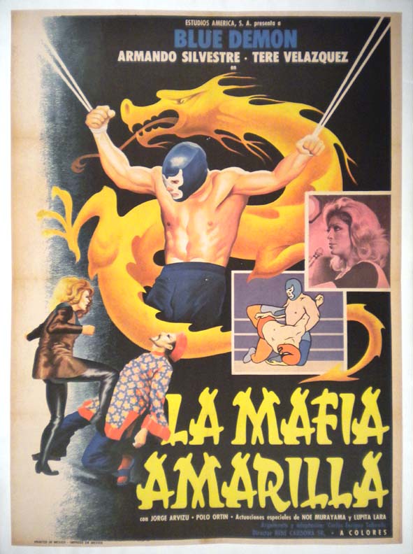Attractive Mexican lucha libre / crime movie poster features a superb central image of a bound Blue Demon being enveloped by a Chinese dragon. Colorful poster with great style!... The film starred Blue Demon, Armando Silvestre, Tere Velazquez, German 'Tin Tan' Valdes and Noe Murayama. (This poster is mounted on linen, so it must be sent rolled.) $325 |