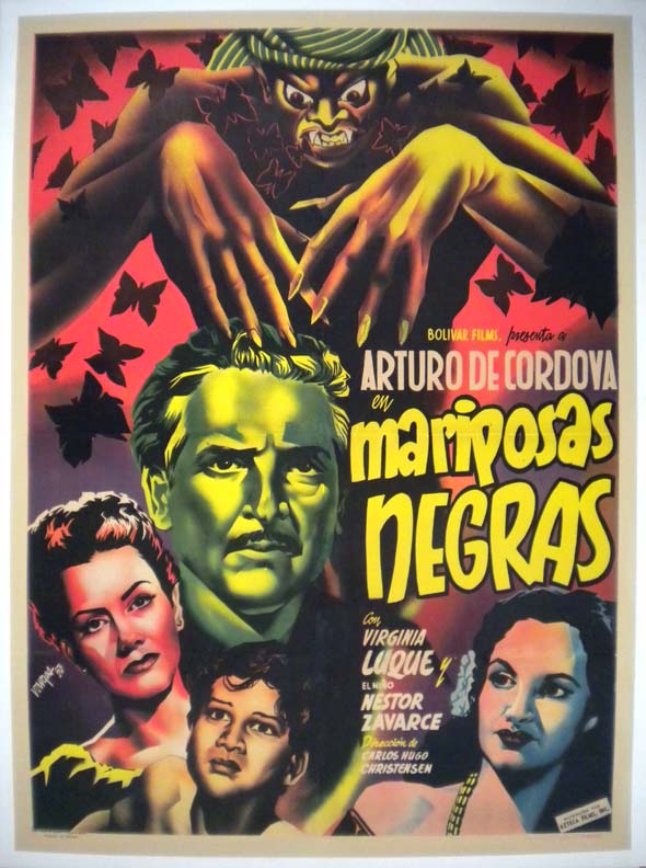 This Mexican horror film poster is nothing short of stunning -- with superb color and incredible horror graphics. The voodoo film was shot in Argentina, but this fabulous poster is from the original Mexican release. There is a bit of restoration along the fold lines, but this is not very distracting. The poster looks great and the colors are still bright!... The film starred Arturo De Cordova, Virginia Luque, Nestor Zavarce and Juana Sujo. (This poster is mounted on linen, so it must be sent rolled.) $335 |