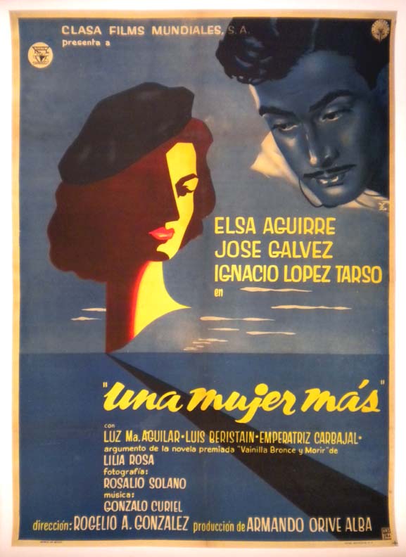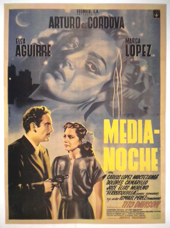Stylish Mexican crime / suspense movie poster is loaded with film noirish imagery -- with a crentral portrait of femme fatale Aguirre. A classic example of the artistry of Jose Espert!... The film starred Arturo de Cordova, Elsa Aguirre, Marga Lopez, Carlos Lopez Moctezuma and Jose Elias Moreno. (This poster is mounted on linen, so it must be sent rolled.) $295 |