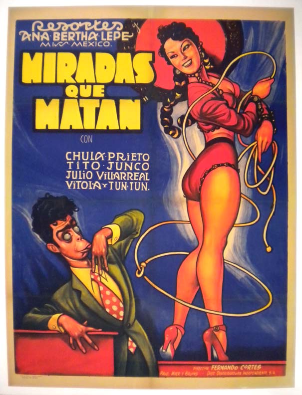 Gorgeous Mexican comedy film poster features a stunning image of the ultra sexy Ms. Lepe, with a love-smitten Resortes looking on. This striking art work is another classic by Ernesto Garcia Cabral -- both whimsical and vibrantly colored!... The film starred Adalberto 'Resortes' Martinez, Ana Bertha Lepe, Tito Junco, Chula Prieto, Famie 'Vitola' Kaufman and Julio Villarreal. (This poster is mounted on linen, so it must be sent rolled.) $795 |
