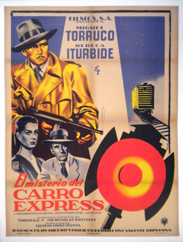 Wonderful Mexican crime / film noir poster features images of femme fatales,tough looking underworld figures, and train related motifs. Great style and layout! There is some toning along the folds and some general touch-up, but these do not detract from the beautiful main image... ... The film starred Rogelio Fernandez, Gilberto Gonzalez, Rebeca Iturbide, Elena Julian and The Nicholas Brothers. (This poster is mounted on linen, so it must be sent rolled.) $395 |