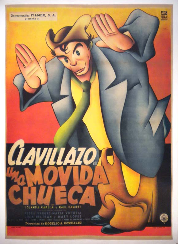 Classic Mexican comedy film poster features a beautiful and highly stylized image of comedian 'Clavillazo.' This desirable onesheet is a true work of art. Gorgeous!... The film starred Antonio 'Clavillazo' Espino, Yolanda Varela, Pedro Vargas, Raul Ramirez, Maria Victoria and Lola Beltran. (This poster is mounted on linen, so it must be sent rolled.) $495 |