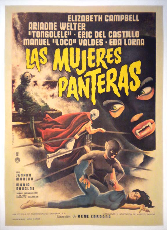Outstanding Mexican lucha libre / horror film poster from the fourth outing in the amazing "Wrestling Women" series. The artwork highlights female wrestlers, a zombie-like monster, a Santo-like masked hero, plus the evil 'panther women' themselves... The film starred Elizabeth Campbell, Ariadna Welter, Tongolele, Eric Castillo and Loco Valdes. (This poster is mounted on linen, so it must be sent rolled.) $350 |